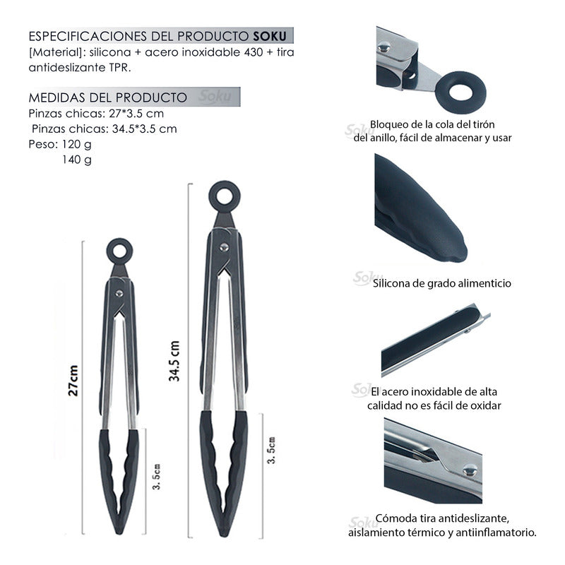 Juego de pinzas de 2 piezas para alimentos. Pinzas de uso rudo hechas con acero inoxidable 430 de alta calidad y puntas de silicona grado alimenticio que resiste al calor hasta 110 grados Centigrados/ 230 grados Fahrenheit.
