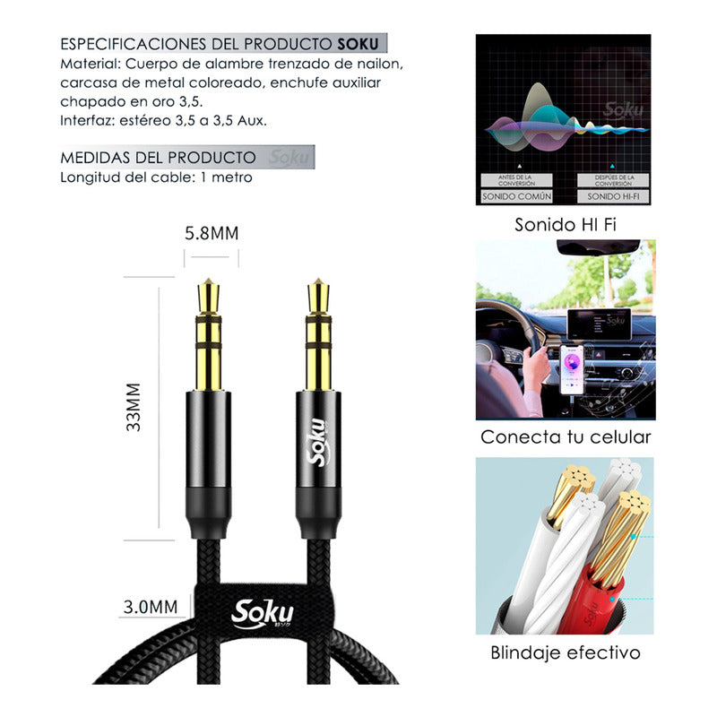 ¡DISFRUTA TU MÚSICA TODO EL TIEMPO!! Cable para audio conexión estándar de 3.5 mm macho a macho. Ideal para conectar tu celular con conector de 3.5mm a y tu Auto Estéreo con conector de 3.5mm (Auxiliar). Más estable que un Bluetooth, mejor calidad que un CD, Sonido Hi-FI estéreo. Tiene doble blindaje contra interferencias electromagnéticas. Durable con resistencia a la oxidación y flexible.